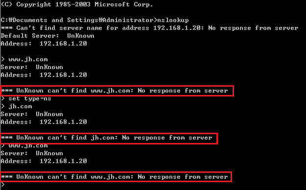 nslookup 진행시 제가 생성한 dns 서버를 검색해봤습니다. 하단에 Name, adress 도 나와야하는데 안나오고 대신 에러문구가 뜹니다.