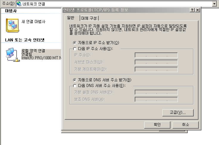내 네트워크 환경 속성 -> 로컬영역연결, 2 -> 속성 -> 인터넷 프로토콜 TCP/IP -> 자동으로 IP 주소 받기 체크, 자동으로 DNS 서버 주소 받기 체크 -> 확인