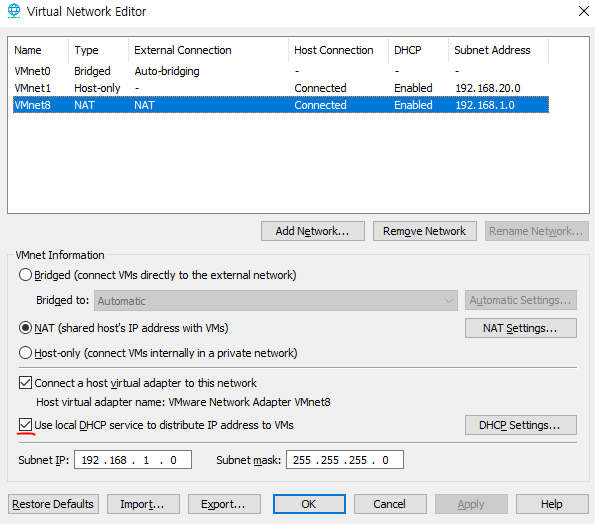 VMWARE → edit → Virtual network editor → VMNET8 → change settings → DHCP 서버 사용 안하도록 체크해제.