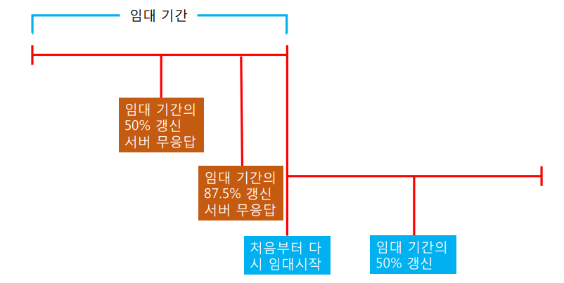 임대기간의 50%가 지나면 DHCP 서버한테 다시 요청(3. Request Packet 재전송) → 만약 응답이 없으면 계속 쓰다가 임대기간이 87.5%가 될때 다시 요청 → 이때도 응답이 없으면 100%까지만 쓰고 다시처음부터 위에 4과정을 거쳐야한다.(Discover Packet 부터)