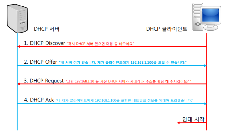 | DHCP Discover Packet 전송 → DHCP Offer Packet 전송 → DHCP Request 전송 → DHCP ACK Packet(응답패킷) 전송 |