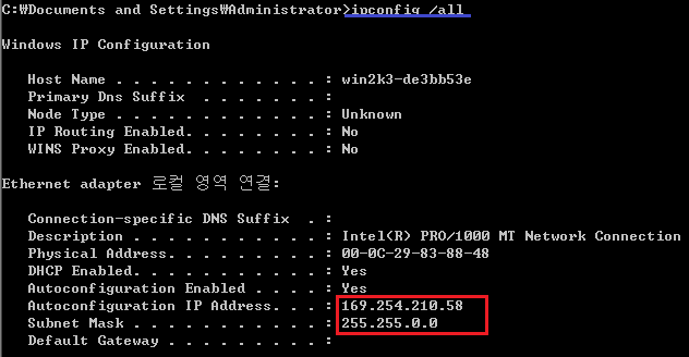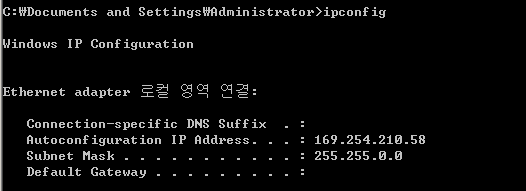 자동으로 발급해주는 IP 대역 169.254.x.x 255.255.0.0