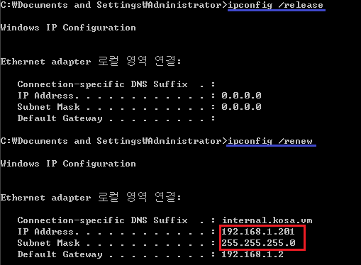 # dhcp 클라이언트에서 IP 주소 다시 요청