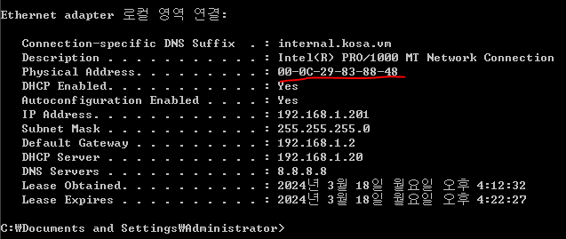DHCP 서버와 DHCP클라이언트가 같은 MAC 주소를 가지고 있는지 확인 > 서로에게 IP주소가 잘 할당되었는지 확인가능