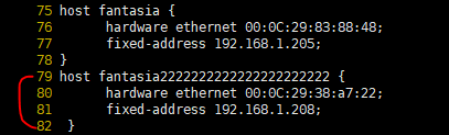hardware ethernet 00:0C:29:83:88:48; # 이 win2003 맥주소에는 항상 특정 ip만 줄것(아래 205)