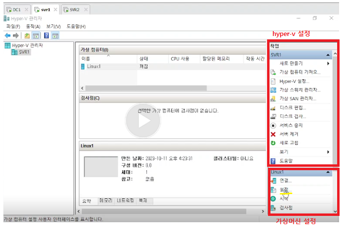 즉, Hyper-V Manager 도구를 사용하여 가상 머신(리눅스, 윈도우 등)을 생성하고 관리 가능