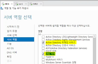 : 서버관리자 > 역할 및 기능 추가 > AD 도메인 서비스, DNS 서버 체크 > 완료