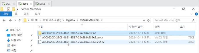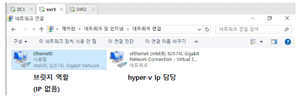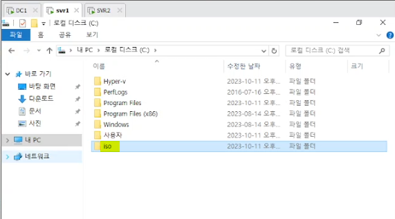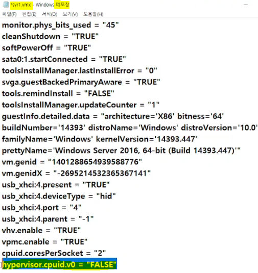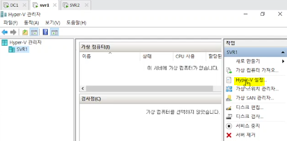 svr1, svr2 : 메모장 맨 아래 항목 추가(hypervisor.cpuid.v0 = "FALSE") → 메모장에 이걸 해줘야 역할 및 기능추가에 hyper-v 가 뜬다.