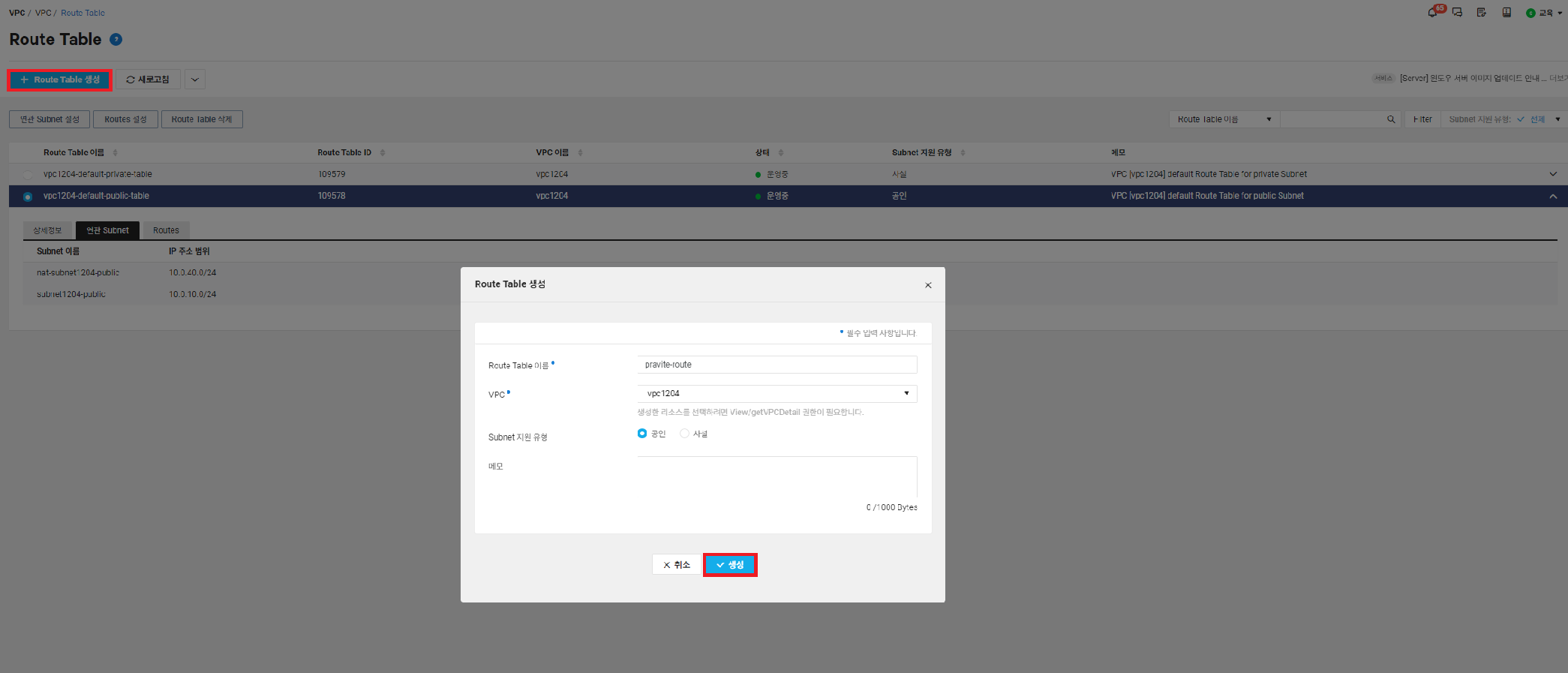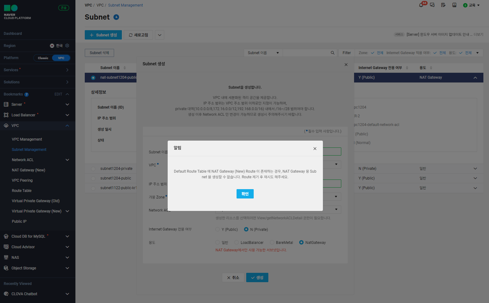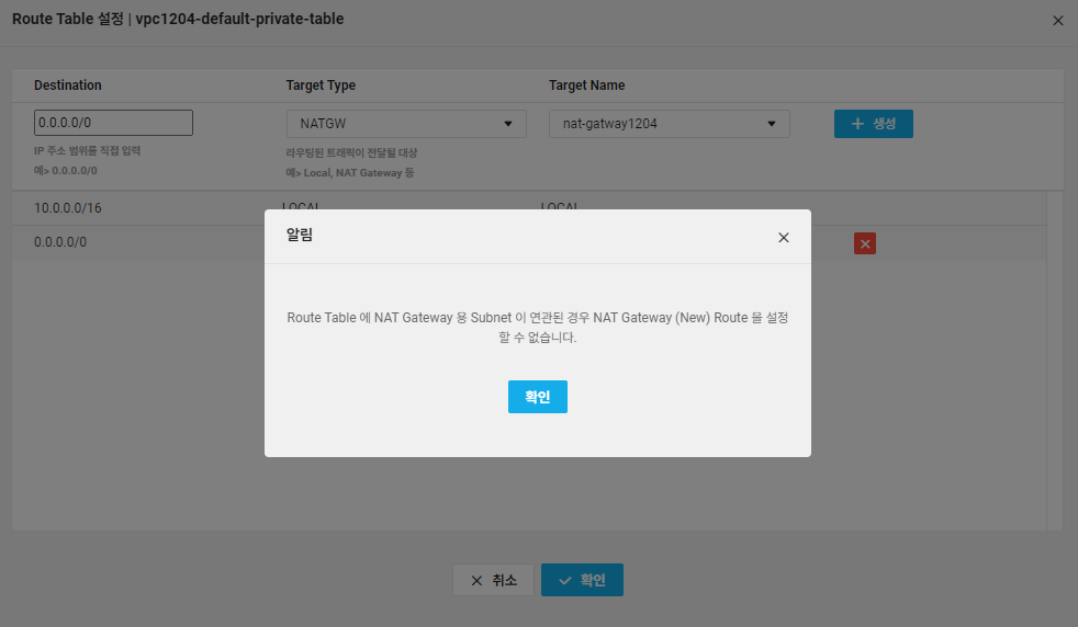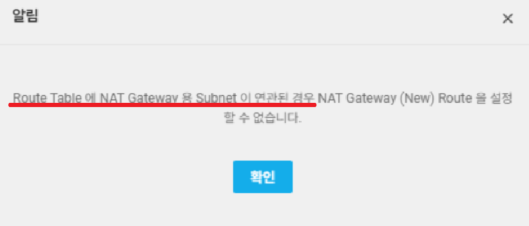 같은 의미로 이미 Nat gateway용 public subnet에 연결된 Nat gateway(공인)과 Route table 연동이 완료되어 있는 상황이라면, Nat gateway용 private subnet은 생성할 수 없습니다. 아래는 private subnet을 생성하려는 와중에 뜬 에러 알림창입니다.