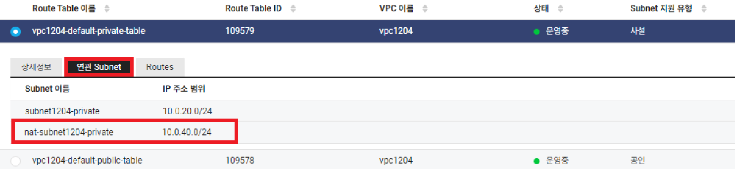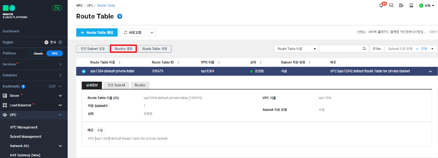 따라서 해결방안은 다음과 같습니다. [연관 subnet]이 붙어있는 경우에는 Routes에 IP주소로 [Routes]를 붙일 수 없기 때문에 nat-private subnet(빈깡통) 삭제 혹은 새로운 Route table로 subnet을 이동해서 Default Route Table(Private)에 nat-private subnet(빈깡통) 자체를 없애줘야지만 IP주소로 Routes 연동이 가능하게 됩니다.