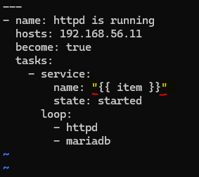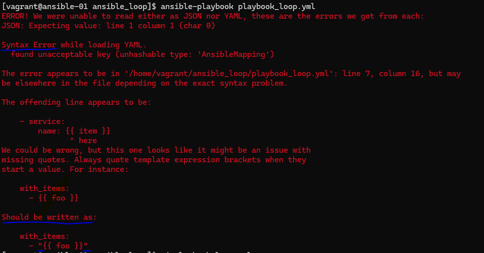 따라서 playbook_loop.yml 파일에 들어가서 확인해보니, {{ }} 괄호 부분에 큰따옴표(" ")가 없었습니다. 에러문구에서 안내해준대로 큰따옴표(" ") 를 추가해주었습니다.